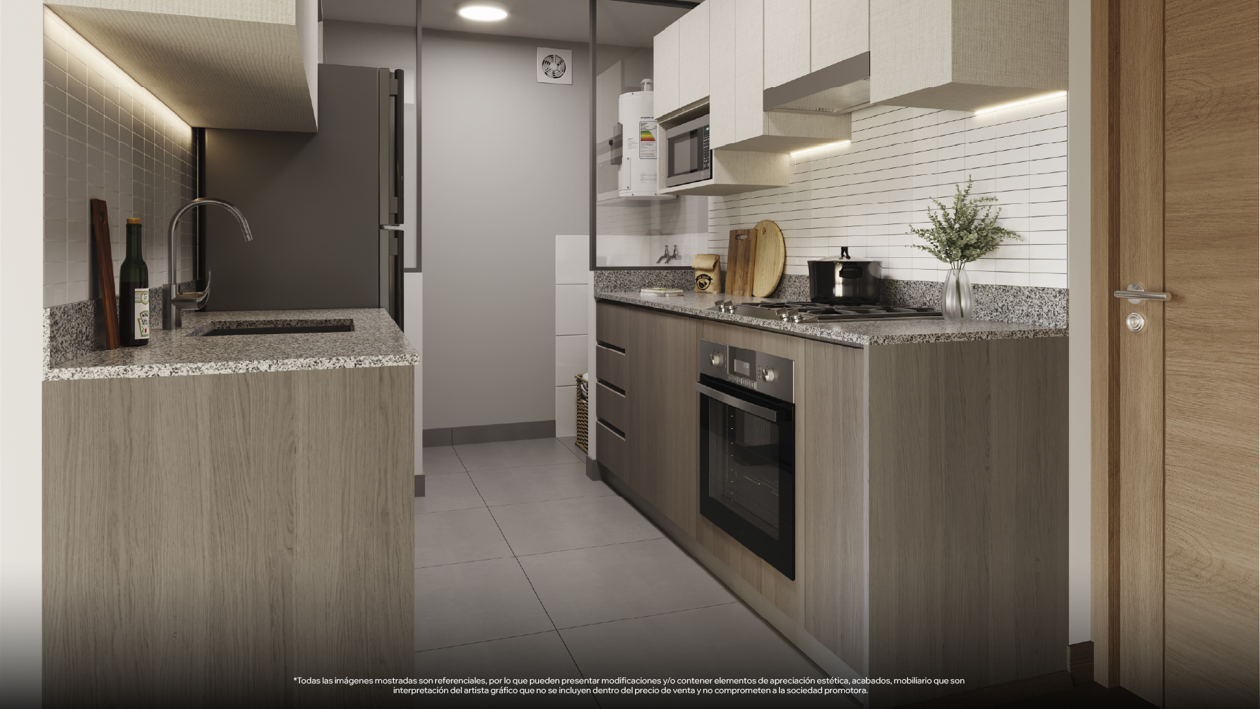 – Equipamiento: cocina encimera + campana extractora + horno empotrado. Incluye luces led y terma para departamentos con beneficio del bono verde.
